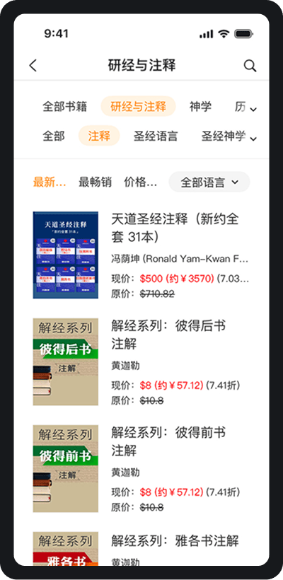 圣经注释、神学著作、传记、祷告、宣教、教会事工、婚姻家庭等;分类齐全,涵盖广泛。